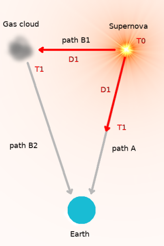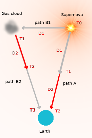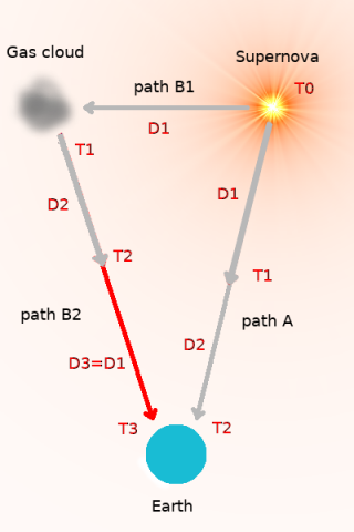 The other path is from the supernova to a cloud of gas, from which the light is reflected to earth. This is path B. Notice that path B is composed of 2 parts: path B1 and path B2.