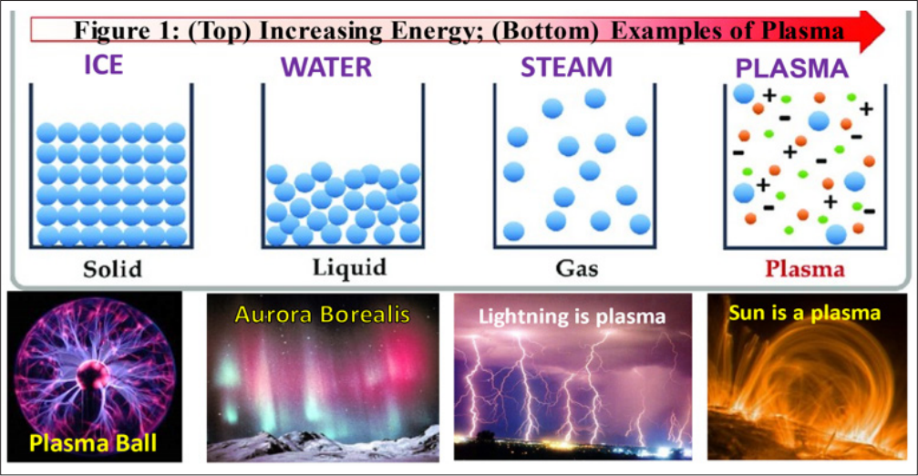 Scientists and professionals from other disciplines, including Medicine, have a different usage of the word “plasma.” Therefore, it might be wise to point out that, in physics and related sciences, the word “plasma” describes the 4th state of matter after solid, liquid and gas. When a gas is heated or energy is supplied, the atoms making up the gas dissociate into their component parts so that negative electrons and positive ions or protons wander around independently of each other. This is the state of plasma (See Figure 1 top row).