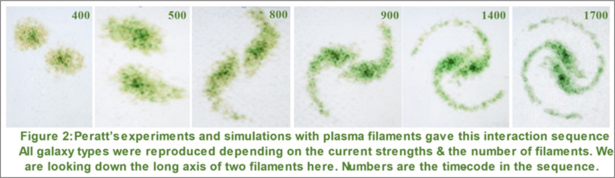 Knowing the ubiquitous nature of plasma filaments, Dr Peratt experimented with plasma in the lab. He recorded plasma behavior, including emission of various types of radiation, using time-streak and framing cameras, special pin-hole X-ray cameras, laser shadowgraphy, ion probes and other types of equipment. The results of the interaction of two or more plasma filaments in the lab, which formed miniature galaxies, were recorded in reference. 20 His updated conclusions were published in his book “Physics of the Plasma Universe,” (Springer, 2015). A typical example of what was happening with these filament interactions in the experiments is given here in Figure 2. Note that, out in space, but unseen in this lab sequence, intergalactic plasma will be trapped between the filaments by their magnetic fields. Also, as the two filaments approach, the intensifying magnetic field pinches and concentrates the plasma and collapses it into the forms seen here and explained further below. The resulting disk-like structures have proportions that correspond to the various galaxies in the cosmos.