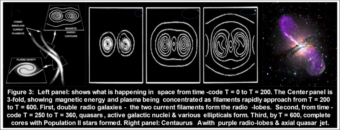 The sequence of events in the lab was important as, observationally, it paralleled what was occurring with actual galaxies out in the universe. The initial situation as the filaments started to approach and then began their interaction, from time-code T = 0 to T = 200, is sketched in the left panel of Figure 3. The 3-fold center panel shows the development that occurs as magnetic field energy is concentrated by the rapidly approaching current filaments through T = 200 to T = 600, and the plasma between the two filaments becomes concentrated as a result. First, double radio galaxies form, with the two current filaments forming the radio lobes on either side of the core. Second, as the interaction goes on and filaments approach more closely, quasars and active galactic nuclei form, which are then followed by the various types of elliptical galaxies between time-codes of T = 250 and T = 360. 21 Third, as the interaction went on, the complete cores of the miniature galaxies had fully formed, along with the “old” or Population II stars by T = 600. 22 By way of illustration in Figure 3, the right-hand panel shows Centaurus A with the purple radio-lobes, and axial quasar jet.