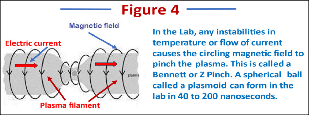 Second, the question as to how star form has an answer in a precise plasma mechanism. Simply put, stars are formed as a result of plasma instabilities. In lesser plasma filaments within a galaxy, any variation in current flow or temperature causes an instability in the circling magnetic field which then suddenly pinches in. This causes all the plasma in that region to be compressed into a ball. It is sometimes called a “Bennett pinch” or Z-pinch and is shown in Figure 4.