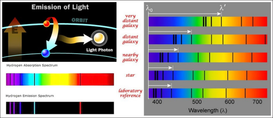 The majority of emitted light comes from atoms as an electron drops from an outer orbit to an inner one. The energy difference between the two orbits is the energy of the emitted photon of light as this image shows in Figure 1 on the top left panel. Alternately, in the reverse process, light is absorbed by an electron when it is elevated from an inner orbit to an outer one. In this case, instead of a bright line on the rainbow spectrum, there is a dark line. If the same two orbits are involved the bright line and the dark line will be in exactly the same position as in the example for hydrogen shown on the two panels on the bottom left in Figure 1. Each element has its own unique differences between its various orbits. This results in something like a barcode of lines on the rainbow spectrum with a pattern which is specific to that element.