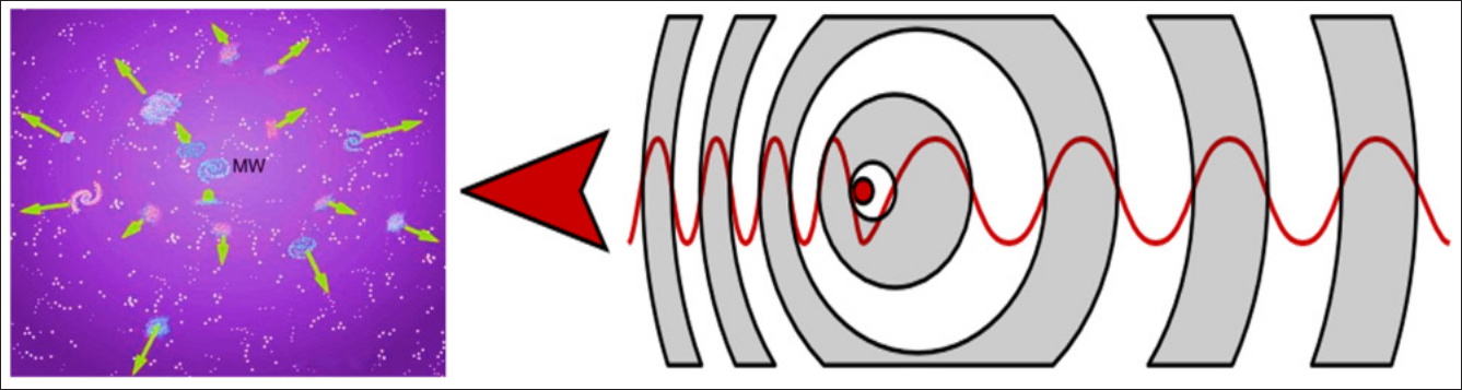 The only other scientifically popular mechanism is to have a static fabric for space-time and galaxies racing away from each other through it (Left in Figure 3, with MW = Milky Way galaxy). This originally was Einstein’s proposal. On this model, the redshift is thought to be due to a Doppler effect. In this effect, light waves coming forward from a moving source ‘bunch up’ ahead of it and are shortened. Light waves moving back from the source trail out behind and are lengthened - giving a redshift. The farther away a galaxy is, the faster it is moving away from us. The faster the motion is away from us, the greater is the redshift. The effect is shown on the right in Figure 3.