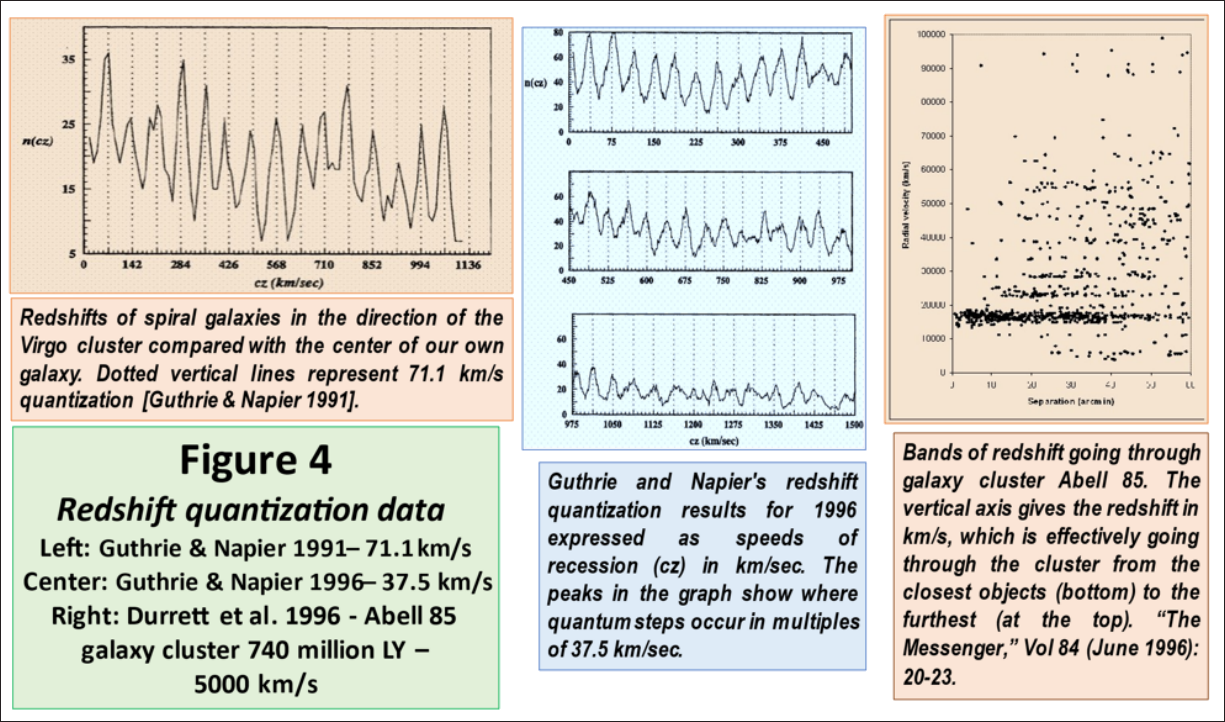 A number of astronomers collected data that supported the quantization concept, but they and the data were both strongly criticized. In 1985, Sulentic and Arp accurately measured the redshifts of over 260 galaxies from more than 80 different groups, and were surprised to discover the quantizations that Tifft and Cocke had found. 6 In an attempt to prove the whole concept wrong, Bruce Guthrie and William Napier of the Royal Observatory, Edinburgh, used the most accurate hydrogen line redshift data available, as well as doing their own measurements and developing rigorous statistical tests. By the end of 1991, 106 spiral galaxies gave a quantization of 37.5 km/s; by November 1992, a further 89 spiral galaxies gave a quantization of 37.2 km/s. 7 8 9 In 1995 a further 97 spirals showed a 37.5 km/s quantization and they submitted a paper to Astronomy and Astrophysics. 10 The referees asked them to repeat their analysis with another set of galaxies, which Guthrie and Napier did with an additional 117 galaxies. The same 37.5 km/s quantization was in this 1996 data set and the paper was accepted. 11 Samples of their data are plotted in Figure 4.