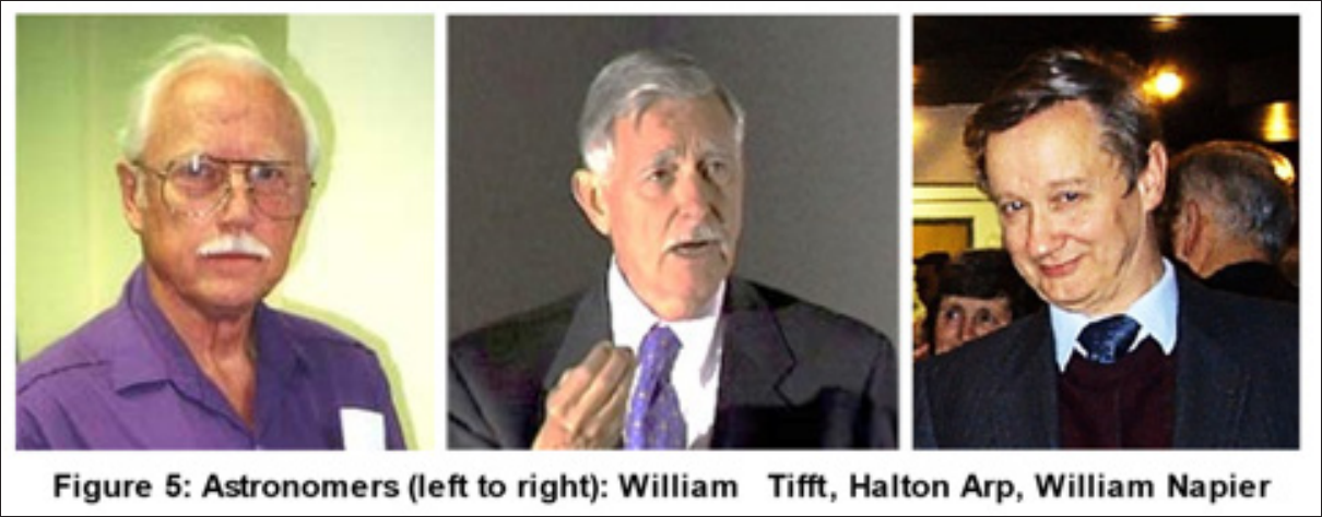 The horizontal axis in Figure 4 is “cz”; in other words, the redshift as a “velocity.” There, the velocity goes from 0 km/s (near our galaxy) up to 1500 km/s (towards the Virgo cluster of galaxies). The vertical axis is “n” or the number of galaxies with a given velocity. The higher the peak, the larger the number of galaxies there is with that velocity. As the graph shows, the velocity does not increase smoothly. If it did, there would be a random scatter about a straight line. Instead, it shows that the galaxies have preferred velocities. Other redshift data go out to the limits of the cosmos. Some 46,000 quasars in the Sloan Digital Sky Survey, Third Data Release (DR3) were examined and “Six quantization peaks that fall within the redshift window below z = 4 are visible.” They found a power peak corresponding to a period of z = 0.70. 12 Note that this presentation is not exhaustive, as a number of other impressive data are available. Figure 5 shows some key astronomers involved.