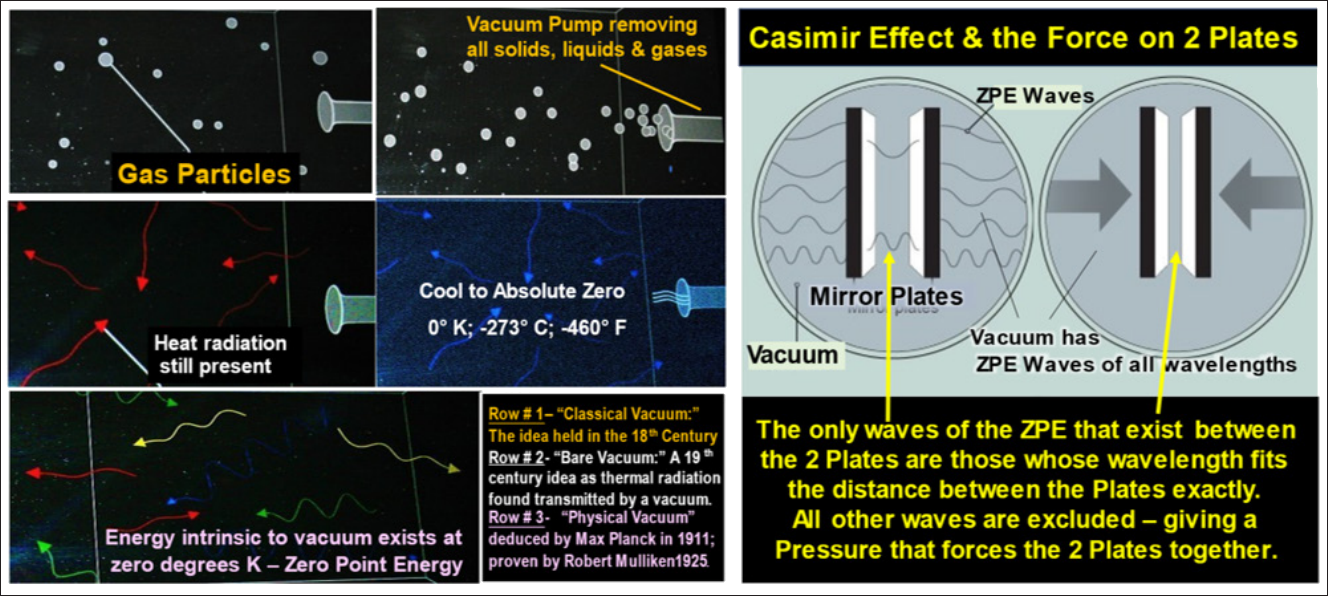 We begin by discovering what the vacuum of space is through a double experiment which gives us important information. Let us take a large, robust, perfectly sealable flask, and then use a vacuum pump to extract all solids, liquids and gases from the flask so no molecules remain. In the 17th and 18th centuries, this had been the concept of a “perfect” or “classical” vacuum, namely a totally empty volume of space. Then in the 19th century, it was discovered that a vacuum would not transmit sound, but would transmit light and thermal radiation. By the late 19th century, it was realized that to get a perfect vacuum in it, the flask had to be fully insulated so no heat could get in or out. The flask then had to be cooled down to a temperature of zero degrees Kelvin, 0 K, or absolute zero – so all thermal radiation had been removed. That is about minus 273 degrees C, or nearly minus 460 degrees F. The result is called a “Bare Vacuum”. 18 However, when this is done, theory deduced by Max Planck in 1911 and experiments by Robert Mulliken in 1925, revealed that an energy, intrinsic to the vacuum, still existed within the flask even at zero K. 19 20 For this reason, the energy is called the Zero Point Energy (ZPE) and the flask contains what is called a “Physical Vacuum.” These concepts are illustrated by the left set of panels in Figure 6.