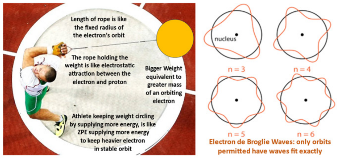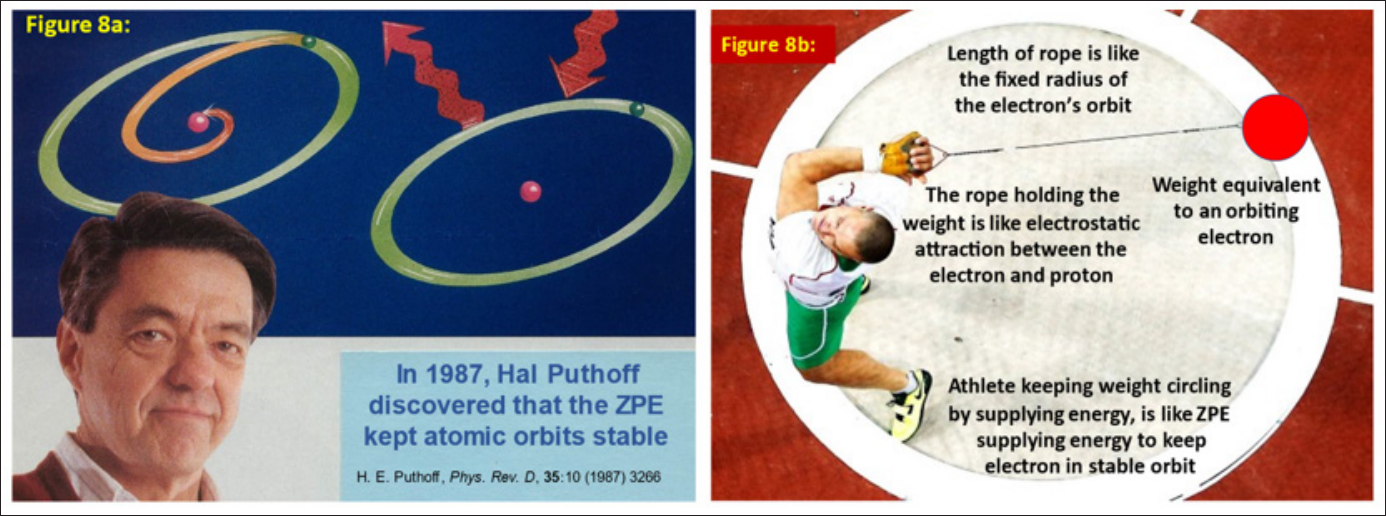 To understand this in a very simplified way using the angular momentum approach, consider Figure 8b. There the athlete is swinging a weight around in a circle. The athlete has to expend energy to keep the weight moving in a circle. Imagine that the weight at the end of the rope is an electron, and the fixed length of rope is the radius of the electron’s orbit. For an atom, the rope is the electrical attraction between the electron and the proton. The action of the athlete keeping the weight circling about him is equivalent to the ZPE keeping the electron moving in a stable orbit and not letting it slow down. We will return to this aspect of the topic in a moment.
