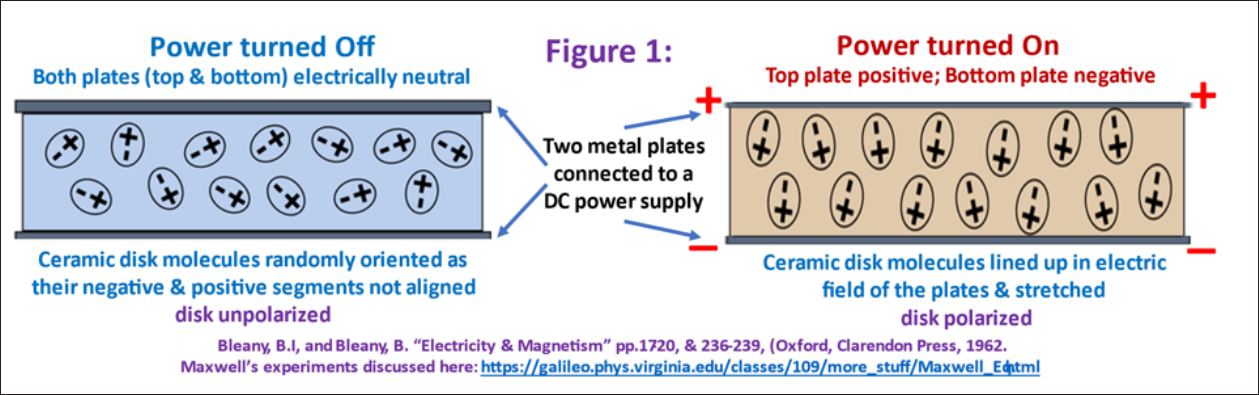Once the voltage difference between the plates is stable, the molecules have stretched to their maximum at that voltage and that is why the current is no longer flowing through the disk. The ceramic disk is then said to be polarized, because all the positive charges are aligned one way and the negative charges are aligned another (See Figure 1). The current in the ceramic disk, caused by the motion of these molecular charges over a short distance, was called a “displacement current” by Maxwell in 1861. The charges are simply displaced a short distance from their original positions.