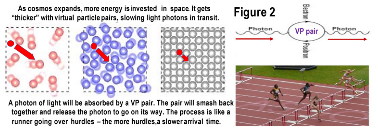 While they exist, virtual particle pairs (VP pair in Figure 2), are able to absorb a traveling photon of light (red arrow). However, the moment they slam back together, that photon is re-emitted and goes on its way – until it hits another virtual particle, and the process repeats. So, the progress of light through space is like a runner going over hurdles. The more hurdles to jump, the longer is the run-time in the race. In a similar way, the more VP in its path, the longer it takes the photon of light to travel the distance through space from its emission to its point of final absorption such as an observer.