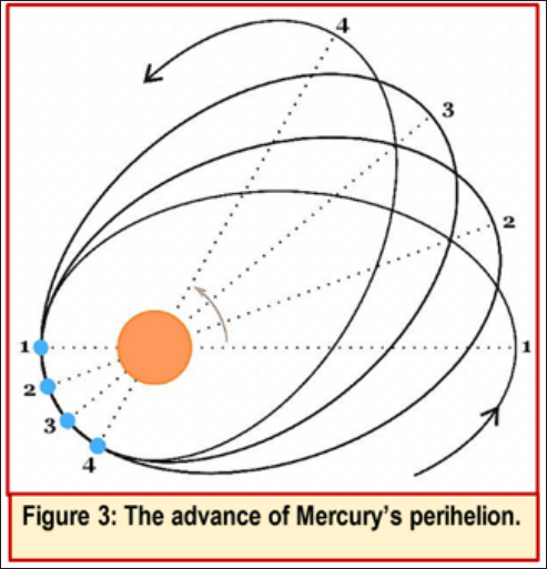 The planet Mercury traces out an elliptical path around the Sun. The closest point of that ellipse to the Sun is called the perihelion. However, Mercury does not trace exactly the same path each time. Rather the path swings around over time. When the path is plotted out, it can be seen that the perihelion position rotates around the Sun. Mercury’s orbit therefore looks something like the situation shown in Figure 3.