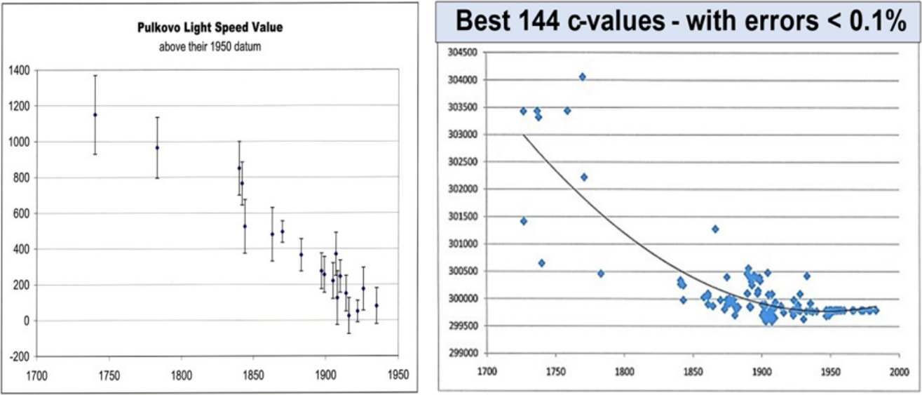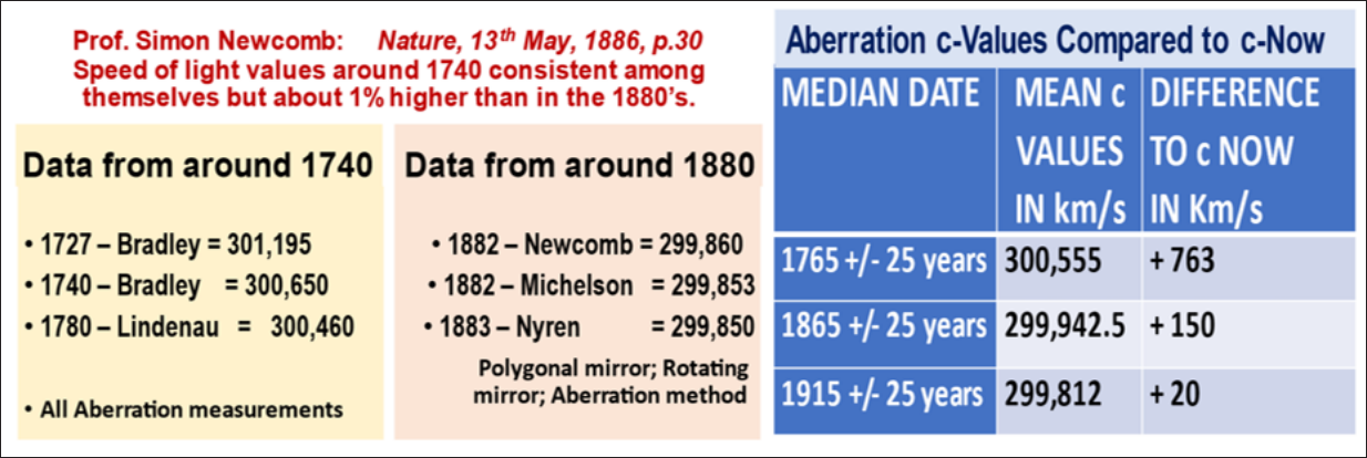 In 1886, Simon Newcomb, Professor at US Naval Observatory, Washington, reluctantly concluded that the values of lightspeed, c, obtained around 1740 were in agreement with each other, but were about 1% higher than in his own time. 55 This is detailed in Figure 4 on the left panel. As Newcomb noted, the data set in each individual time-slot were in agreement with each other. However, when the two time-slots were compared, there had been a drop in the measured value of c of around 650 km/s. In 1941, Raymond T. Birge, Professor of Physics, Uni. California, Berkeley, made a parallel statement while writing about the c values obtained by Newcomb, Michelson and others around 1880. Birge conceded that “…these older results are entirely consistent among themselves, but their average is nearly 100 km/s greater than that given by the eight more recent results”. 56 The fact that both these scientists preferred the concept that the value of c was constant, as did many others, makes their admission of declining experimental values significant.