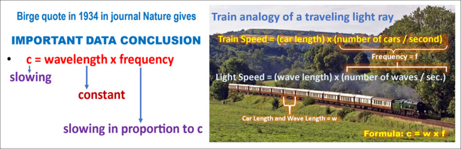 What Birge is saying here is an important data conclusion. He says that, since wavelengths of light are not changing as the speed changes, this can only mean that the frequency of light changes by the same proportion that the speed changes as light travels through space. The train analogy in Figure 6 shows that this really is a quite reasonable proposition and not at all as improbable as Birge thought.